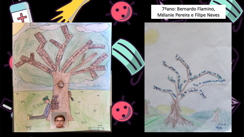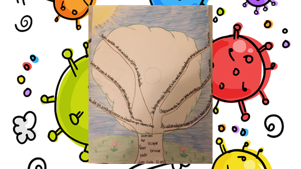 Terminado o confinamento cada grupo escolheu frases únicas e um elemento para caracterizar os alunos face ao problema, foi por todos escolhida, a árvore, um símbolo de vida, de força e de coragem. No tronco, cada aluno descreveu através das frases, as ações temporais e nos ramos as vivências.