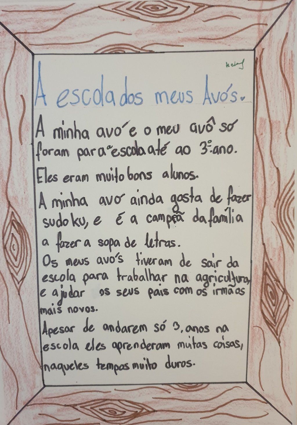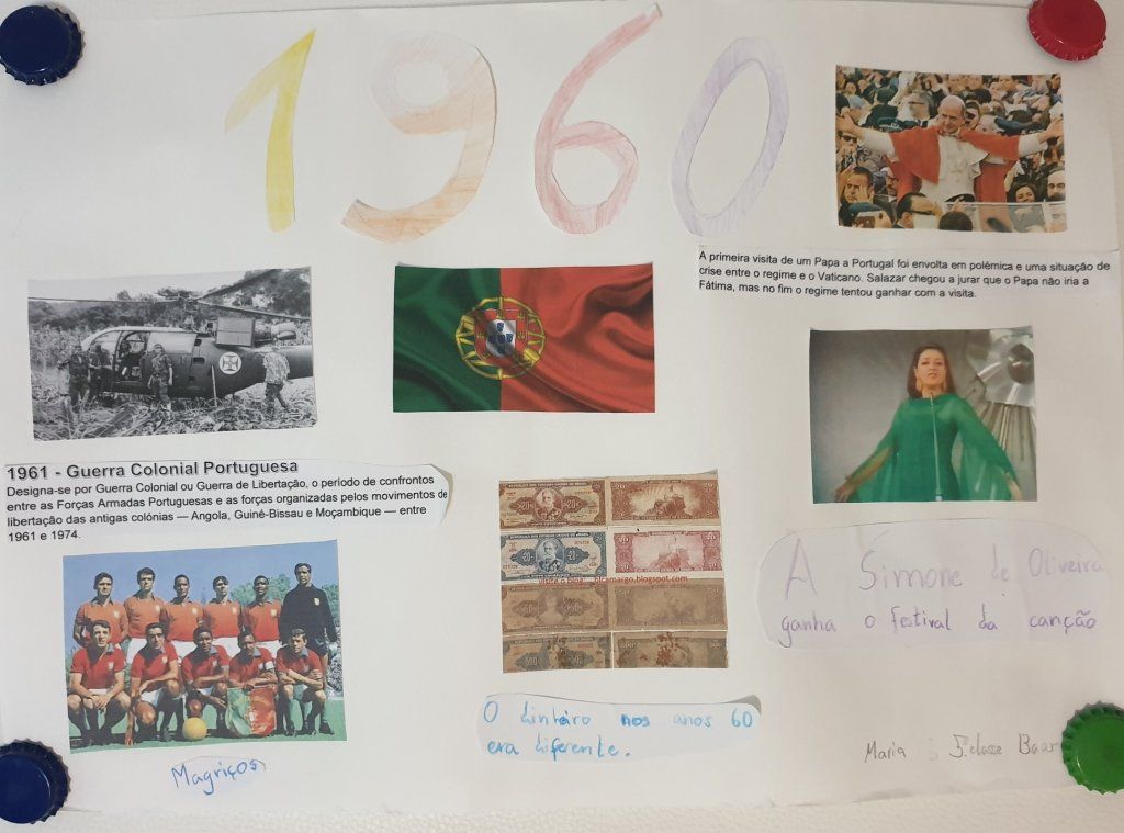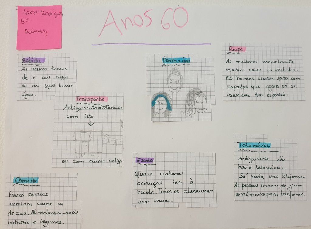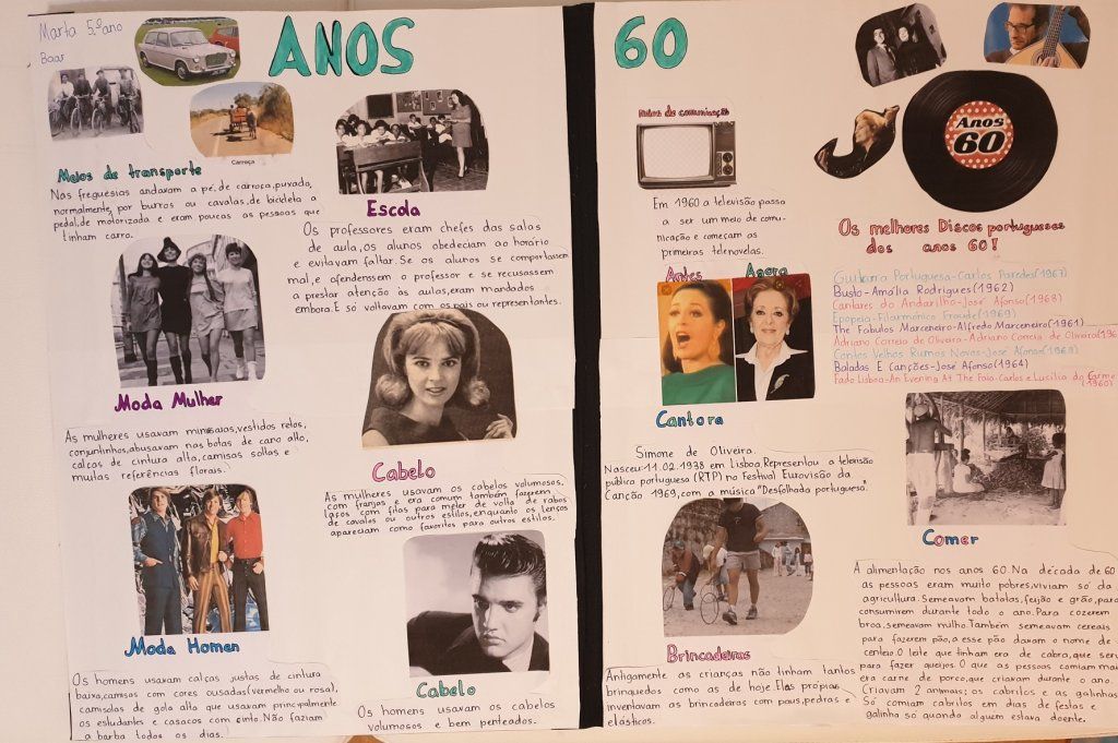 Os alunos fizeram uma pesquisa prévia, em casa, seguindo-se a visualização em aula de imagens e vídeos, onde todos puderam dar a sua opinião, reproduzindo também histórias que lhes foram contadas. Realizaram trabalhos alusivos à época, através de recortes de revista e escrita de texto. Estes foram expostos e realizou-se uma síntese daquilo que foi feito, podendo, desta forma, desenvolver a compentência de expressão escrita e a oral.