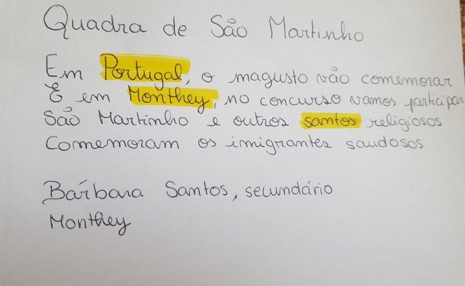 A docente acredita que os alunos ao fazerem uma quadra alusiva a um tema, para além de reverem conteúdos, obriga-os a pensar em vocabulário adequado e em diferentes palavras, sinónimos, rimas… Considera que é um exercício excelente, motivando-os para a expressão escrita.