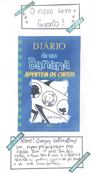 Este é o meu livro favorito. É o começo da minha Banda favorita. O Diário de um Banana é a minha Banda favorita porque o personagem principal é parecido comigo. O Greg é o personagem principal. Ele gosta de vídeo jogos, não gosta muito de ir á escola e come muito. O meu dia, dia é parecido com o dele. Durante a semana era uma grande seca para ele. Ao fim de semana já era diferente. Ele podia dormir até mais tarde e podia jogar vídeo jogos. O livro é sempre emocionante. Também gostei da estrutura do livro. Não é daqueles livros que é só texto. Todas as páginas têm pelo menos uma imagem e eu aconselho o livro para aqueles que também tem uma semelhança com o Greg e para os que não gostam de ler muito.