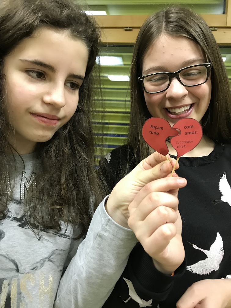 De forma a celebrar o dia de S. Valentim, tendo em conta que é um dia em que se deve valorizar entre alunos a amizade e os afetos, a docente Isabel Pereira preparou um conjunto de atividades que combinaram palavras e acões, resultando não só em simples exercício de resolução, mas também num delicioso desfeche. Os alunos pesquisaram receitas de chocolate e algumas mensagens sobre a amizade e tiveram de, em conjunto com os Encarregados de Educação, relacionar expressões idiomáticas e adjetivos cujo tema era o coração. No final, surgiu um registo de mensagem e poemas.